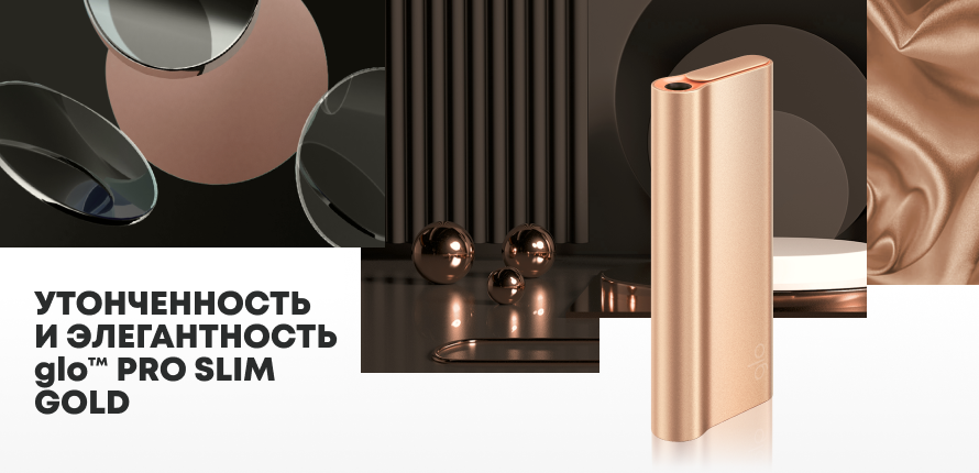 Девайс glo™ pro slim в новом цвете! Элегантный премиальный дизайн в легендарном золотом цвете. При его создании мы вдохновлялись роскошными аксессуарами, традиционными золотыми украшениями и изысканными ювелирными изделиями. glo™ pro slim GOLD является самым тонким устройством для нагревания табака (в линейке устройств для нагревания табака glo™ в России 2022 года) благодаря новой форме и уникальному дизайну.