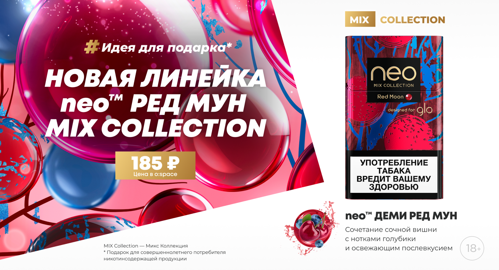 neo™ Ред Мун — это изысканное сочетание сбалансированного табачного бленда и насыщенного вкуса вишни. Микс дополняют оттенки голубики и освежающее послевкусие.