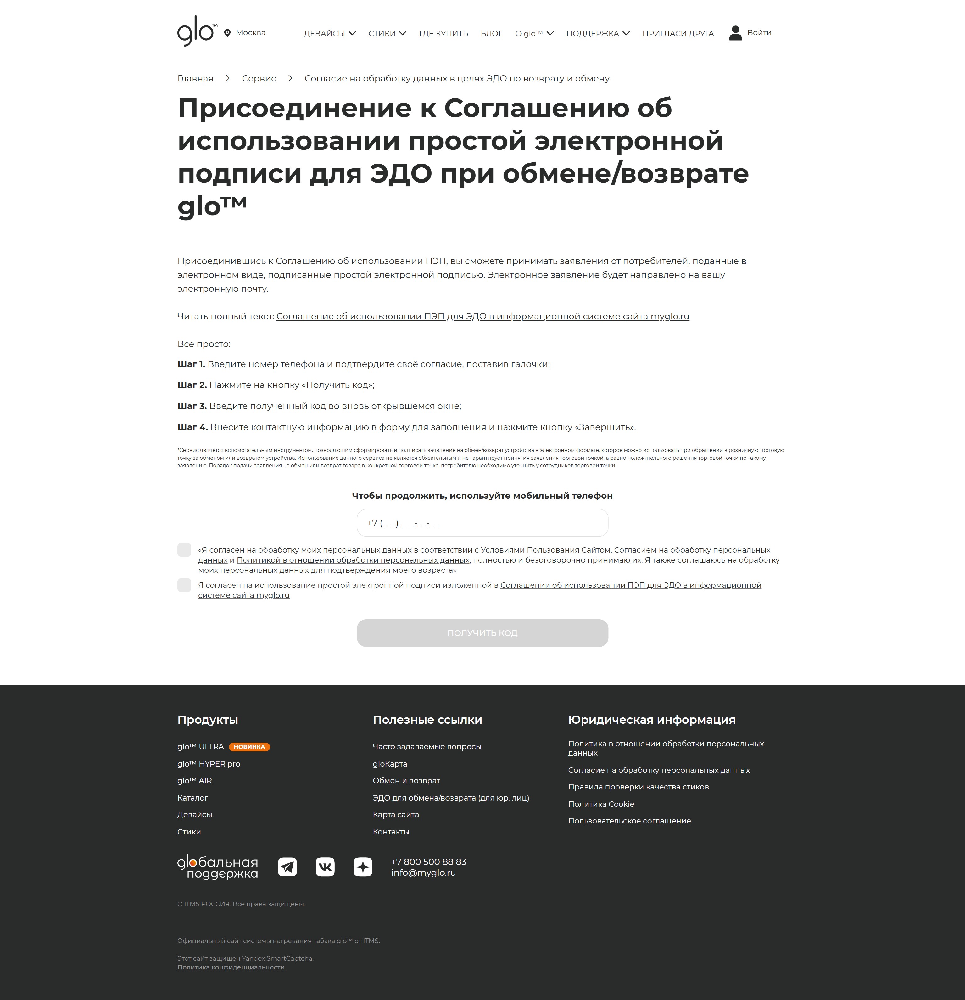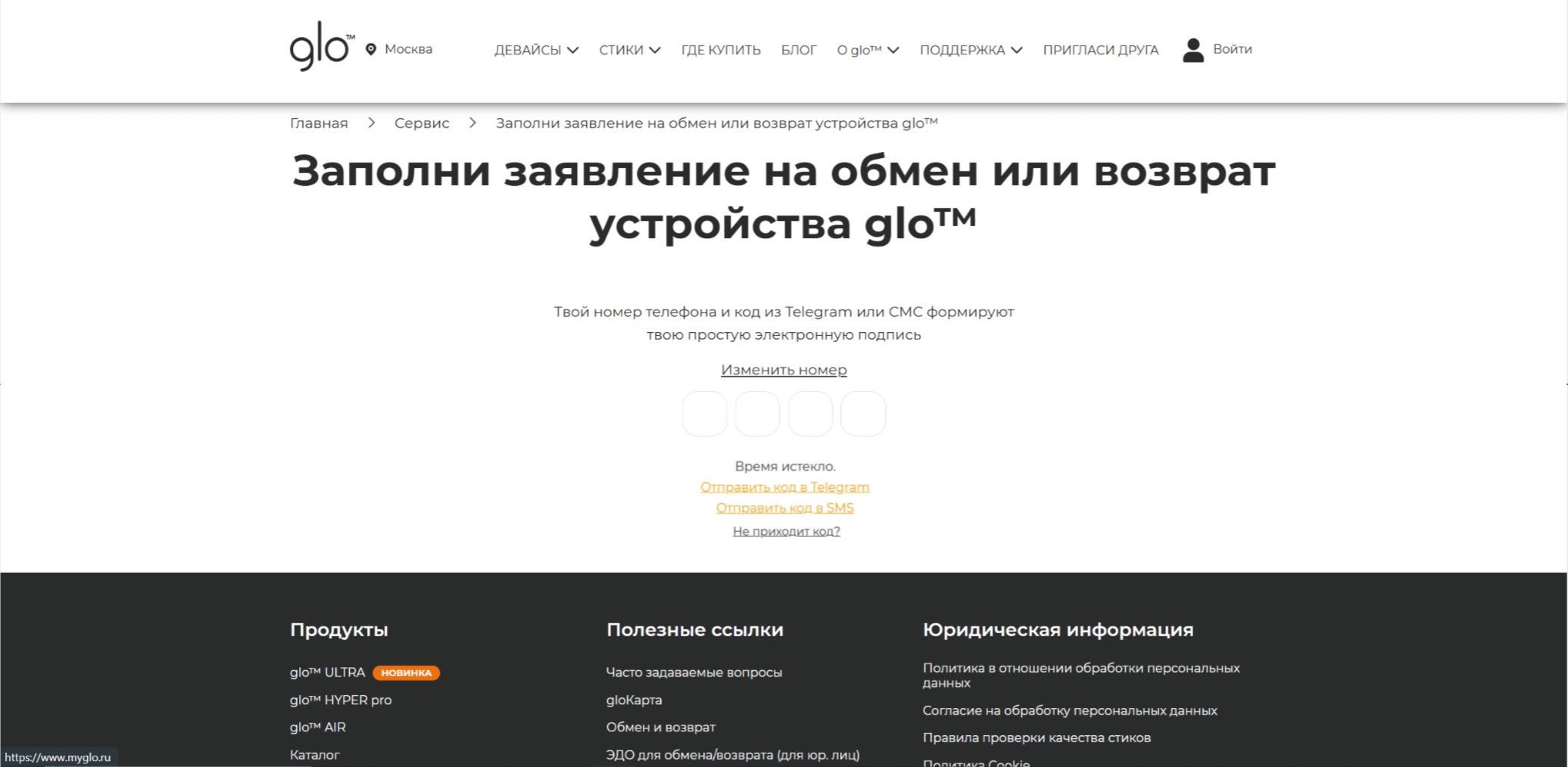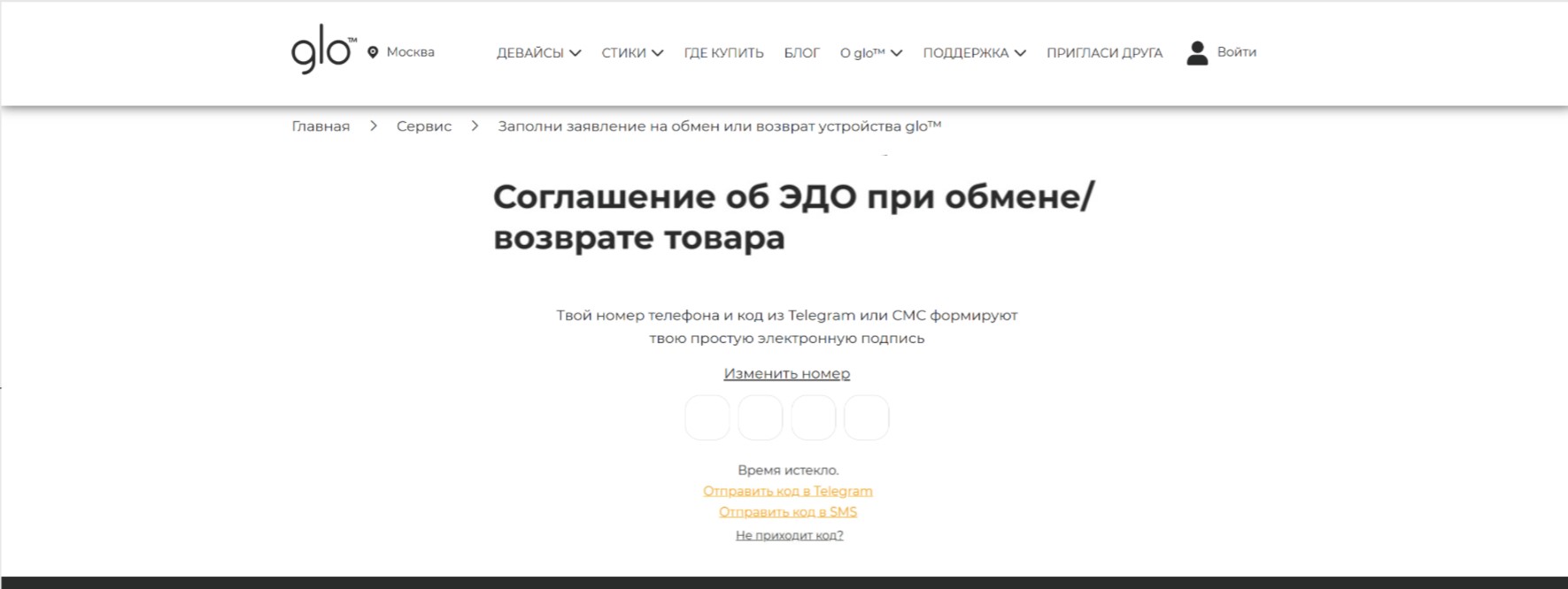 4.3 Изготовление (генерацию) кода и отправку кода через сообщения в мессенджере «Telegram» или СМС-сообщение Потребителю, указанных в п. 4.2, инициируется Потребителем, который верифицировался в ИС на странице сервиса https://www.myglo.ru/vozvrat-obmen.