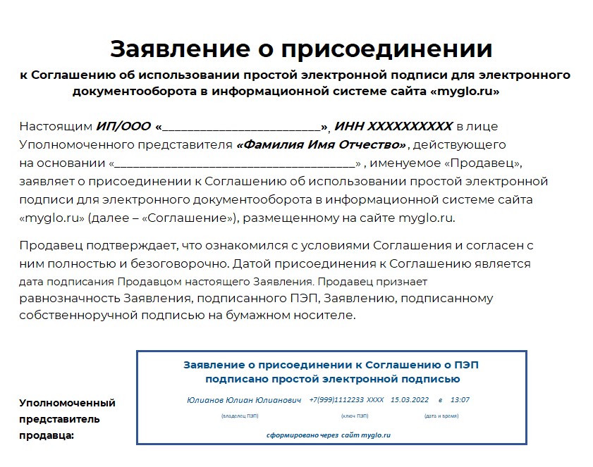 3.6 Заявление о присоединении к настоящему Соглашению, инициированное Уполномоченным лицом, которое было им сформировано в ИС и подписано ПЭП, приходит на электронную почту Продавца. Настоящее Соглашение подписанное Продавцом путем присоединения к нему, позволяет принимать электронное Заявление Потребителя на обмен/возврат товара, которое сформировано и подписано ПЭП Потребителя в ИС сайта myglo.ru. При этом подписание Заявления Потребителя со стороны Продавца не требуется. О принятом решении по полученному Заявлению Потребителя Продавец доводит до Потребителя в устной форме.